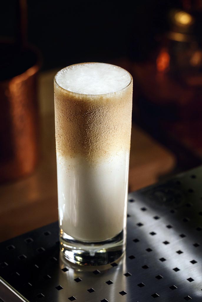 La inspiración para esta receta me llegó en forma de postre, hace más de 8 años. El postre era una especie de bombón de chocolate sobre una sopa de crema inglesa. Tanto me gustó la crema que pensé en hacer un cocktail con ese ingrediente. Tardé más de 8 años en materializarlo. El cocktail en sí mismo es un twist entre un Ramos Fizz y un Golden Fizz. La parte láctea y la yema de huevo de las recetas originales se reemplazan por crema inglesa ( leche, yemas de huevo, vainilla y azúcar). El sirope de pistacho casero junto con el mace le dan mucha profundidad a la receta. El polvo de bizcocho surgió cuando realicé un óleo-saccharum de limón que no soltó el aceite esencial de la fruta y me encontré con un montón de pieles de limón azucaradas, con una fragancia increíble. Entonces decidí deshidratarlas en el horno a baja temperatura, tamizarlas y hacer un polvo que sabe a los bizcochos que preparaba mi madre.